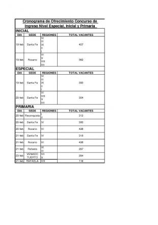 Cronograma de Ofrecimiento Concurso de Ingreso Nivel Especial, Inicial y Primaria