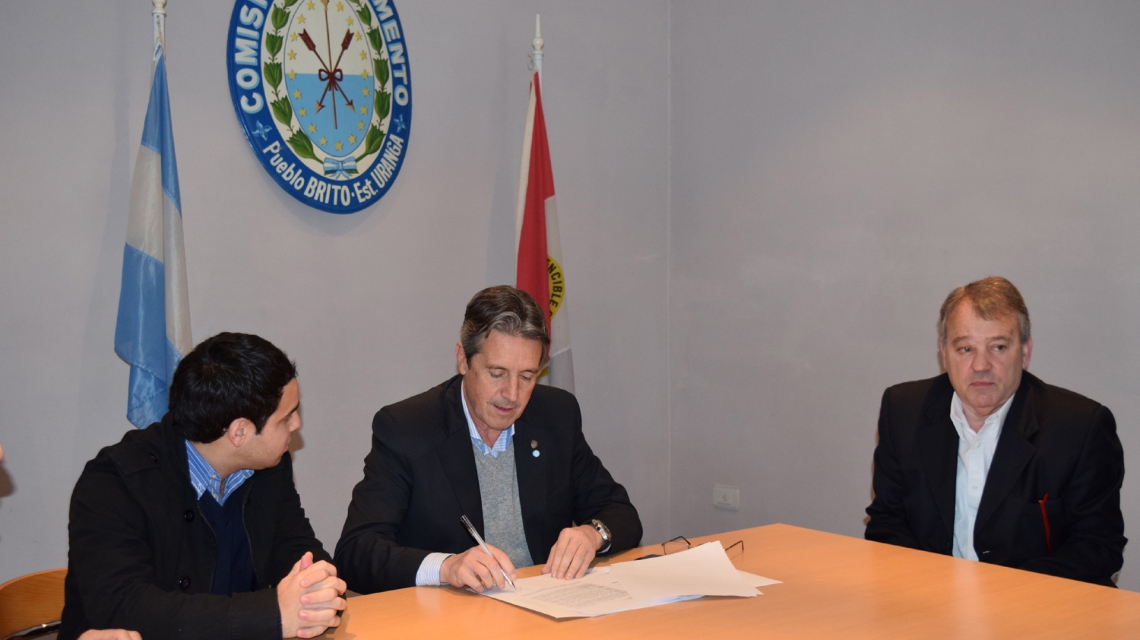 El ministro de Infraestructura y Transporte, José Garibay, junto al presidente comunal de Uranga, Alex Sabbatini, rubricaron este jueves un convenio con la comuna del departamento Rosario, para la ejecución de obras de ampliación de la red de colectoras del sistema de desagües cloacales, beneficiando así a gran parte de la población de dicha localidad.