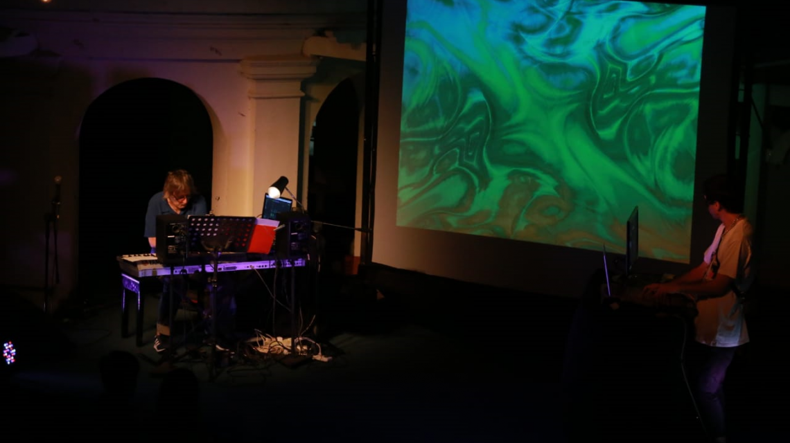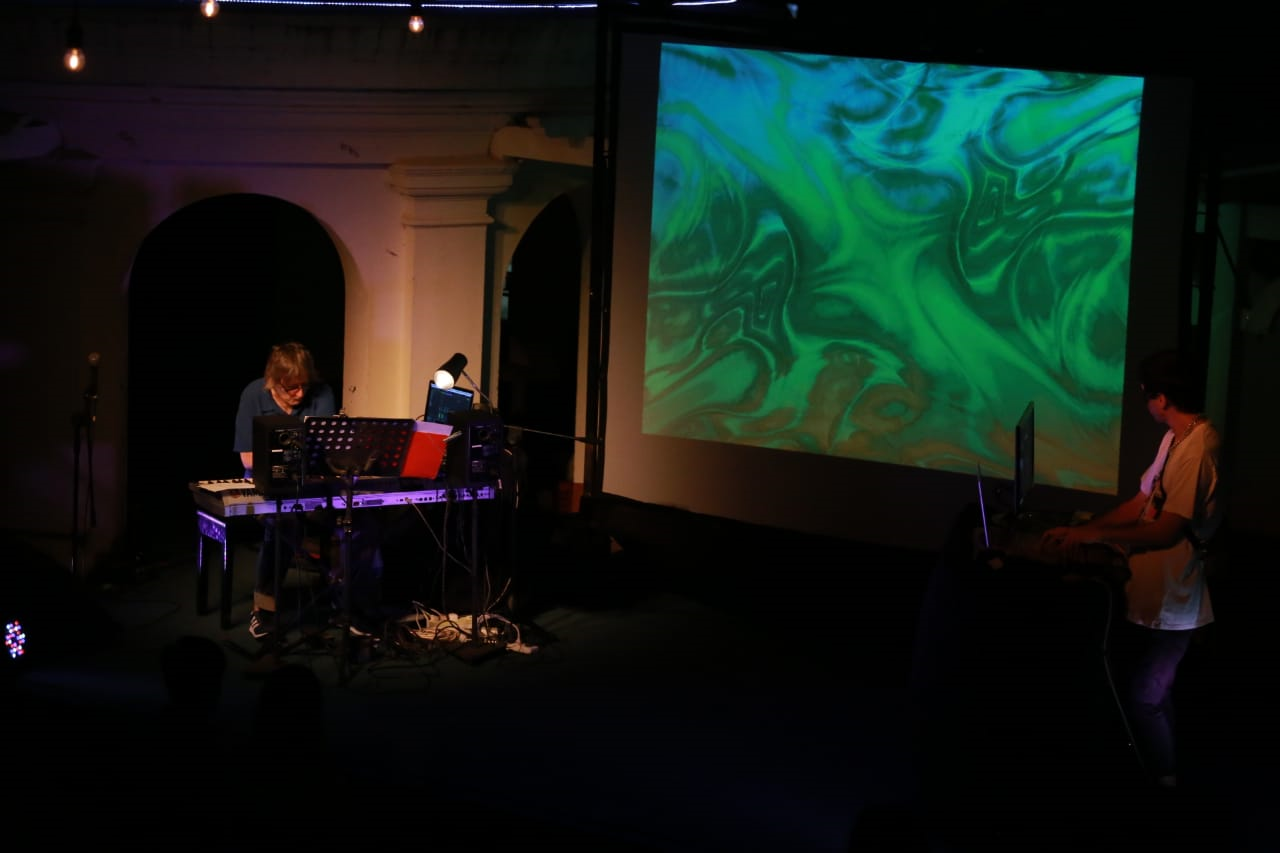 El músico, de larga, brillante y prolífica trayectoria, irrumpió en el escenario poco después de las 21. Y sin mediar palabra, comenzó a tocar el piano, equipos electrónicos de sonido y una computadora, con una pantalla de video en la cual se veían imágenes que acompañaban el espectáculo, que colocaba CyberAngel.