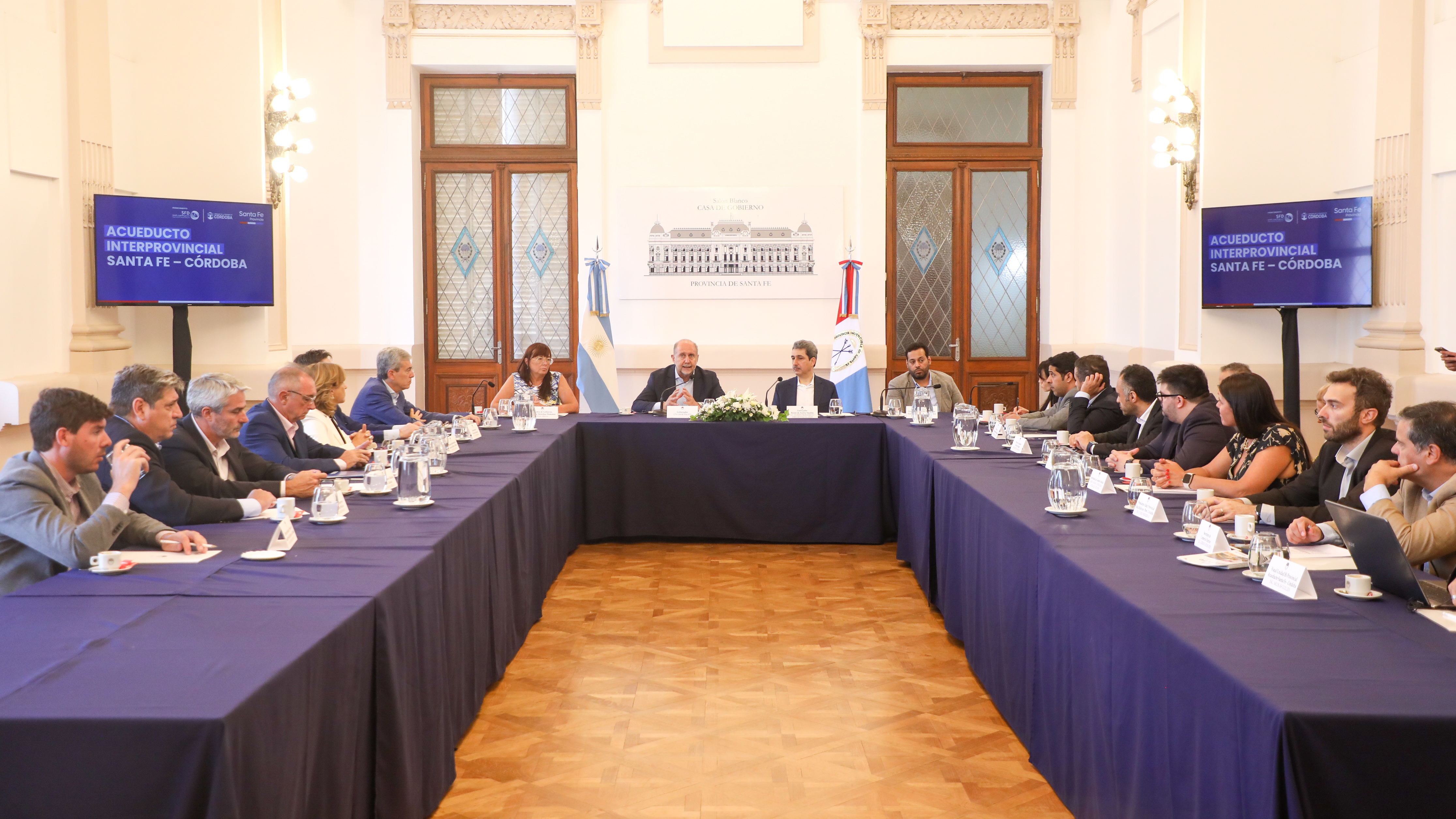 El gobernador Omar Perotti recibió este martes a la delegación del Fondo Saudí para el Desarrollo, encabezada por el Embajador de Arabia Saudita, Hussein Mohammad Abdulfatah Alassiri, a quienes se presentó el potencial de la provincia de Santa Fe y el proyecto completo del Acueducto Interprovincial Santa Fe – Córdoba. Específicamente, se busca financiamiento para el bloque B y C de la Fase I - Etapa I, y esta obra sería la primera financiada por dicho Fondo en la provincia.