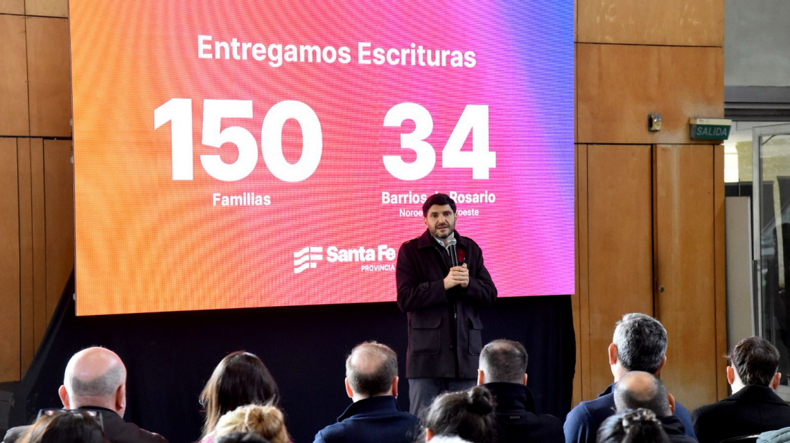 Con el objetivo del Gobierno provincial de garantizar los títulos de propiedad, el gobernador Maximiliano Pullaro, entregó este viernes escrituras a 150 familias de 34 barrios del noreste y sudoeste de Rosario.