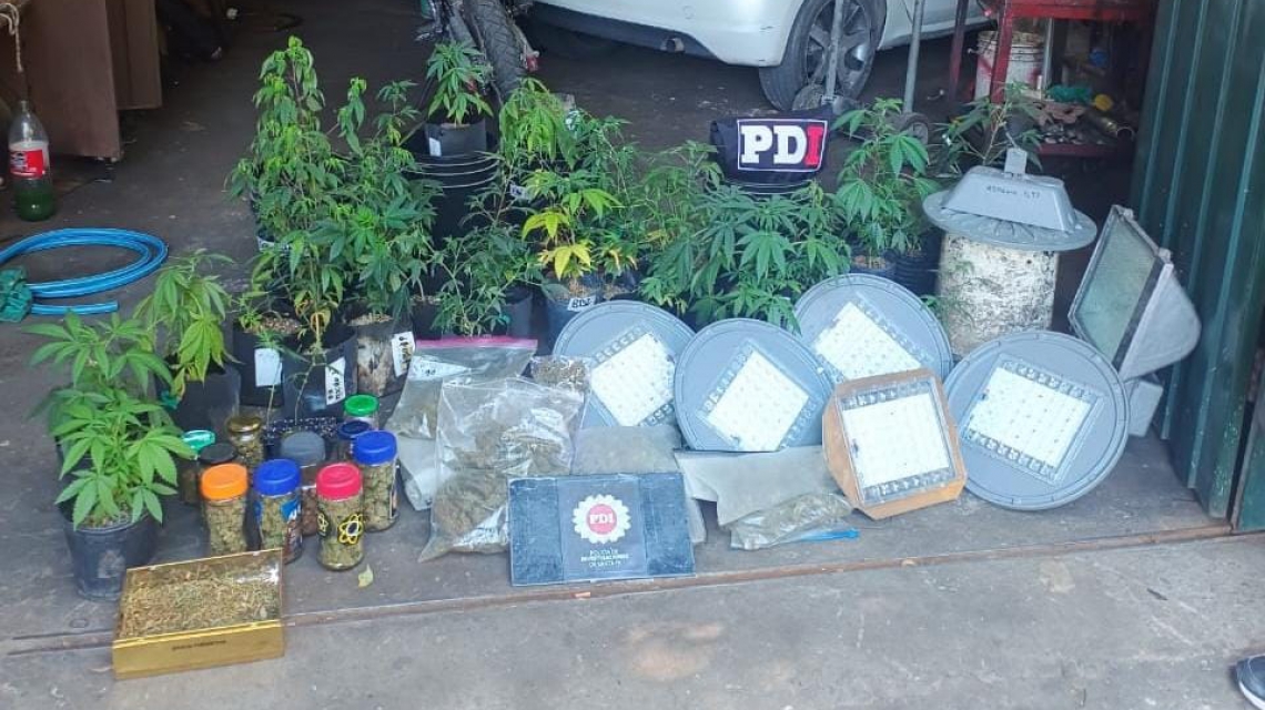 Las tareas investigativas se iniciaron luego de las denuncias por robo de las luces, y tras las medidas dispuestas por los fiscales Carlos Covani y Guillermina Torno, personal del Departamento Operativo de la PDI, Región II, Distrito (Rosario) allanó el domicilio donde funciona un taller mecánico en el que resultaron aprehendidos Horacio Mauricio C., de 62 años, Jonatan Mauricio C., de 34, Mauro Joel C., de 32 y Patricia Claudia C, de 61. La PDI logró dar con seis lámparas led colgantes y una con balastro que estaban siendo utilizadas para el vivero, en el que había 39 plantas de marihuana, 11 frascos de vidrio con marihuana y 8 bolsas de nailon con el mismo contenido. Asimismo, se secuestraron 3 teléfonos celulares, 200 dólares, 199 reales y 1.916.000 pesos argentinos.