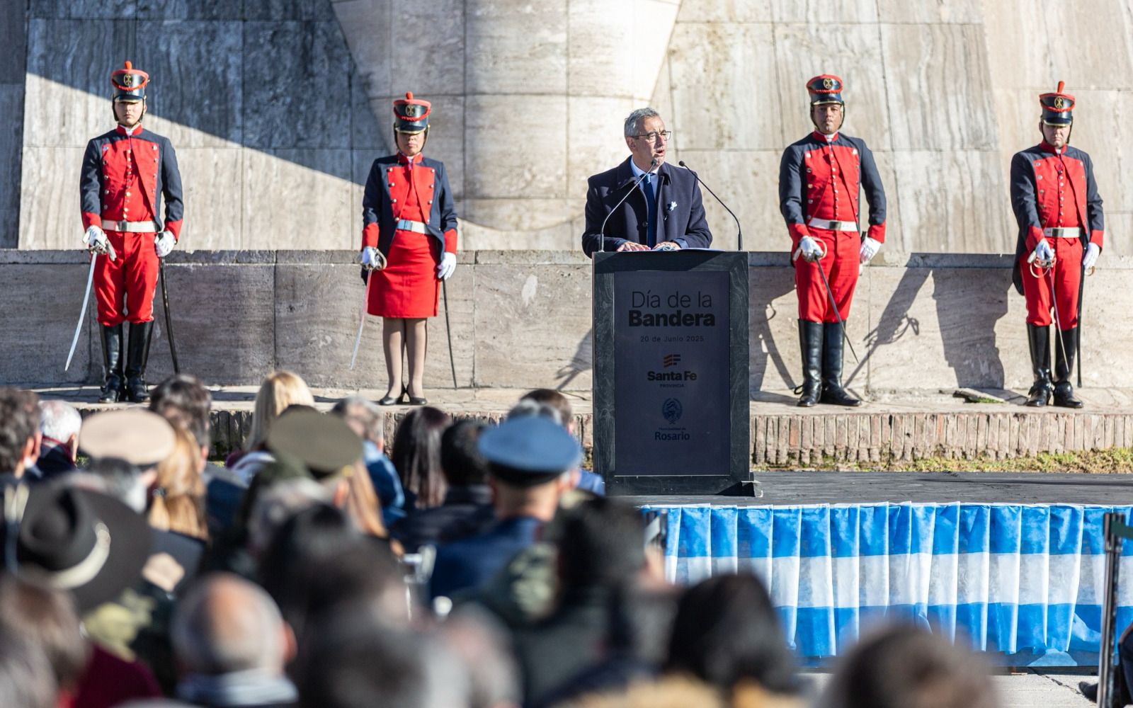 Luego del izamiento de la bandera nacional en el mástil mayor del Monumento, el gobernador Maximiliano Pullaro brindó su discurso central: “El pueblo y los gobiernos de la Nación, de la provincia y de la ciudad nos unimos bajo una misma bandera, que está por encima de nuestras diferencias ideológicas o partidarias. La bandera es unidad, es respeto por el otro. Es esa identidad colectiva que muchas veces nos quisieron arrebatar, pero que cada 20 de junio venimos aquí a defender”, afirmó.