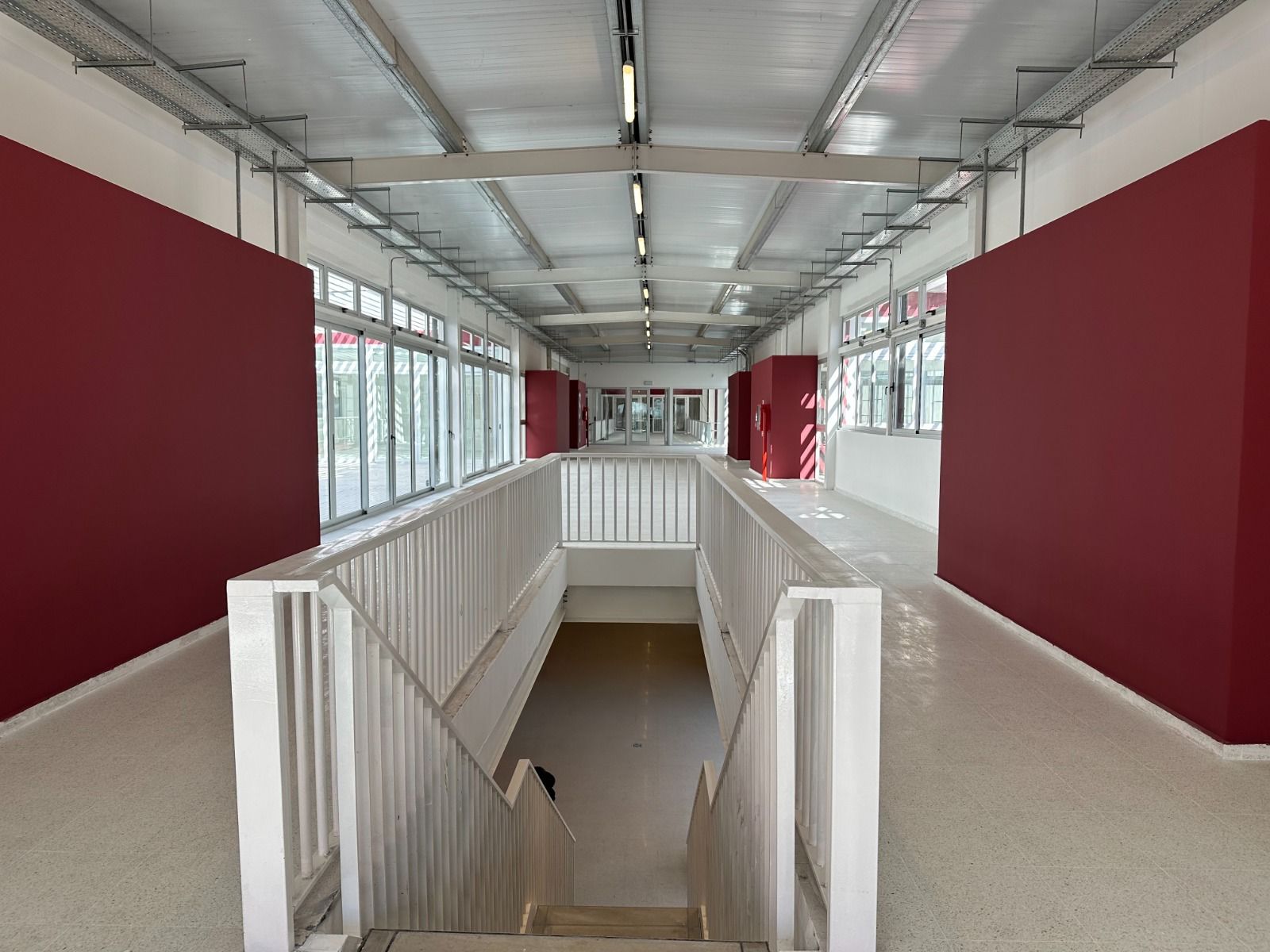 En la planta alta, el desarrollo del edificio suma 7 aulas más, sanitarios, una amplia terraza, pasarela de conexión, dos talleres, un sector administrativo y un amplio salón de usos múltiples