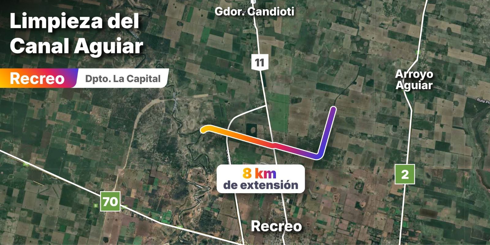 El Canal principal Arroyo Aguiar tiene una extensión de 24 kilómetros y su función es interceptar y desviar los caudales del norte de Santa Fe hacia el oeste, evitando que lleguen a las zonas urbanas de las localidades mencionadas.