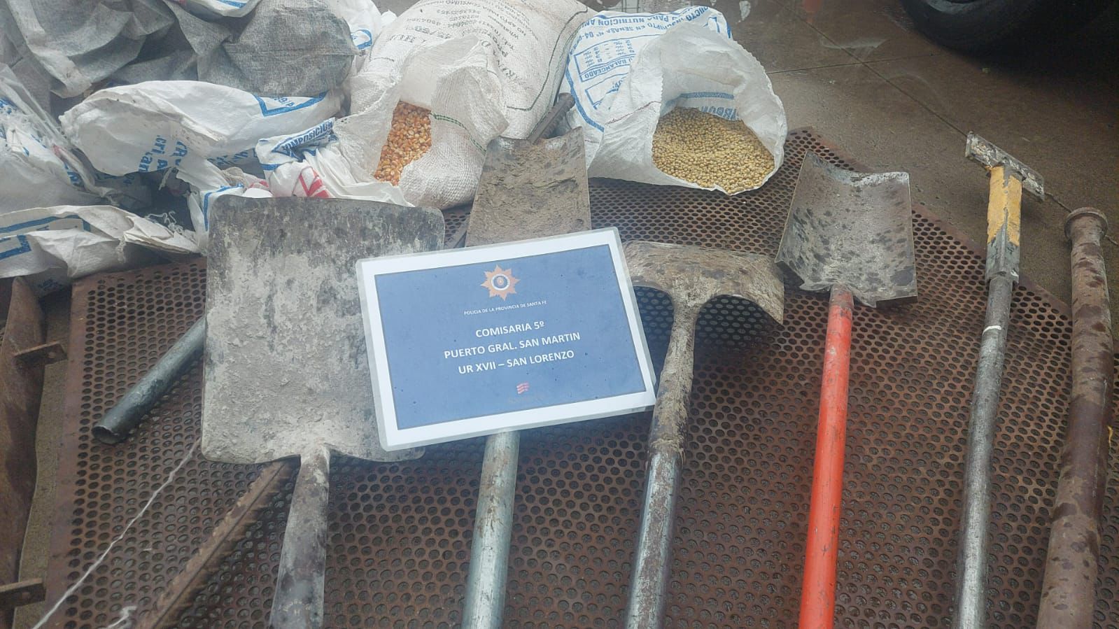 Además de la detención de un hombre identificado como Robustiano O. de 55 años, efectivos policiales secuestraron una camioneta Dodge RAM, palas, martillo, hierros con punta rectangular que se utilizan para abrir las boquillas de los camiones, bandejas de metal para zarandeo, una carretilla, bolsas con maíz y soja.