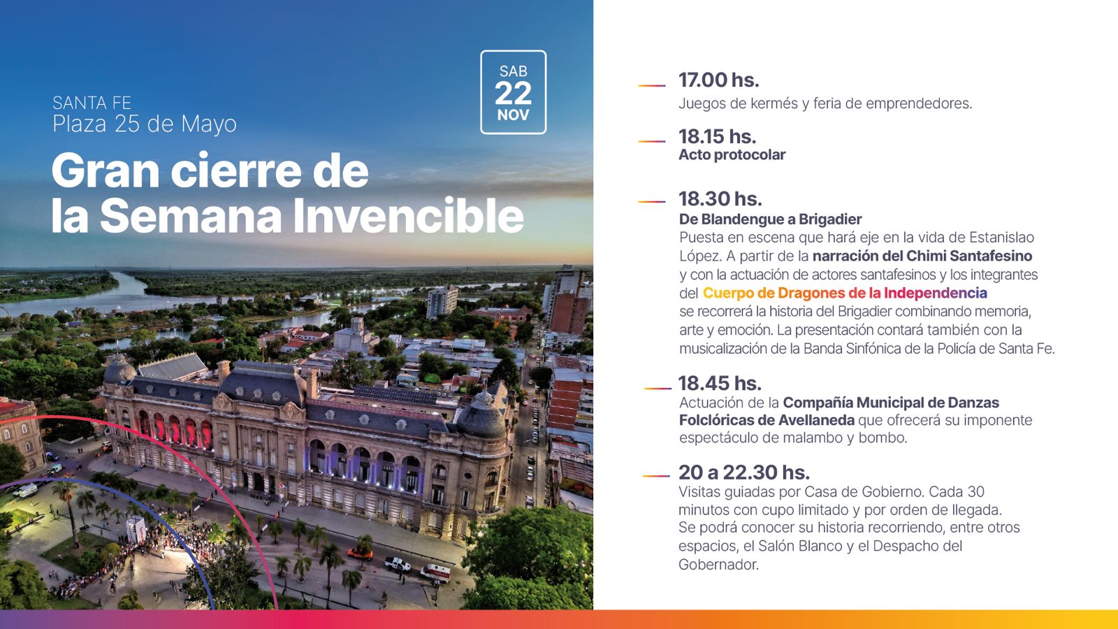 La Plaza 25 de Mayo, frente a la Casa de Gobierno, será escenario para el cierre de la Semana Invencible. Este sábado 22, a partir de las 17, el Gobierno de la Provincia desplegará una atractiva propuesta para celebrar el 239 años del nacimiento del Brigadier General Estanislao López.