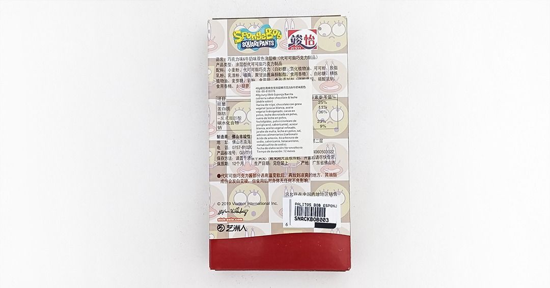 * Informe de Laboratorio Nº 53161: referido a Acta de Toma de Muestra Nº 20718, Producto Barrita Cubierta sabor chocolate y leche, marca Junyi Bob Esponja, contenido 48 gramos. Lote 19/09/2025. Fecha de elaboración 19/09/2025. Validez 18/09/2026.