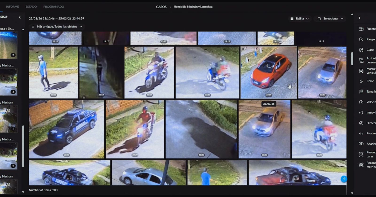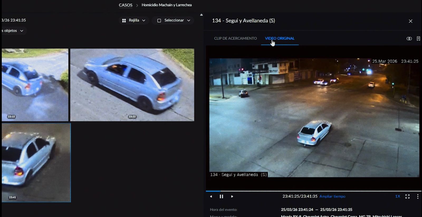 En pocos minutos, Lince identificó movimientos clave en la escena: la llegada de una motocicleta, el contacto con un individuo en la vía pública y, segundos después, la aproximación de dos personas con vestimenta oscura al lugar donde se produciría el ataque.