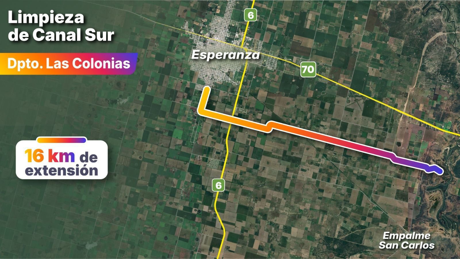 “En este canal estamos desarrollando, junto al Comité de Cuenca, las tareas de limpieza y desmalezamiento a lo largo de 16 kilómetros. En esa extensión, el Canal Sur conduce los excedentes hídricos desde el casco urbano de Esperanza hasta su desembocadura en el Río Salado. Y en ese recorrido también permite acelerar el escurrimiento del agua proveniente en zonas rurales de Empalme San Carlos, favoreciendo el drenaje de áreas productivas”, explicó el ministro Enrico sobre el alcance de la obra.